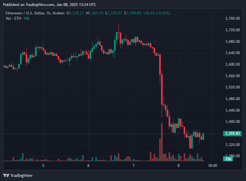 In just ten minutes following the announcement of the Ethereum Foundation’s sell-offs, ETH lost 0.6% of its value. According to Coingecko data, the second-largest cryptocurrency by market capitalization has dropped 7.9% in the past day, and it is currently selling at $3,346 per coin.