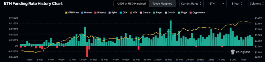 Telling trends can be seen in a review of ETH financing rates, a crucial measure of how aggressively people purchase or sell in the futures market. Funding rates skyrocketed as ETH approached the $4,000 threshold, indicating intense buying pressure.