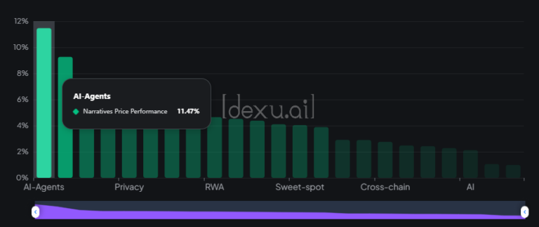 The AI coin and agent story continues to be the most popular, with the new DeFAI category coming in second. Both in terms of price performance and social media mindshare, the narrative leads. As creators and liquidity move to agent tokens, the industry is still seeing a rollover from meme tokens. Agents competed similarly to memes due of the readily available means for token generation.
