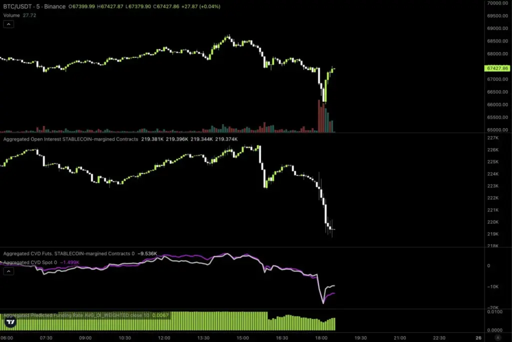 For Bitcoin, long liquidations quickly accelerated, targeting the accumulated liquidity. The accumulation of liquidity at $67,000, which had been weighing on Bitcoin over the previous day, was erased by the downward price movement.